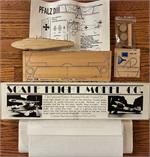 Complete precut balsa block components, cast metal 3 blade props, wheels, decals, card jigs. Circa. 1946